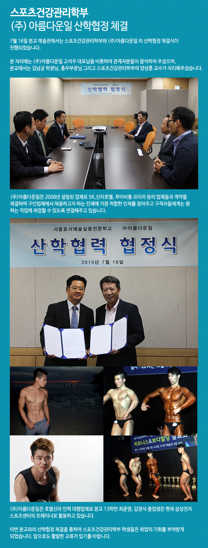 7월 16일 본교 예술관에서는 스포츠건강관리학부와 (주)아름다운일 의 산학협정 체결식이 진행되었습니다.
