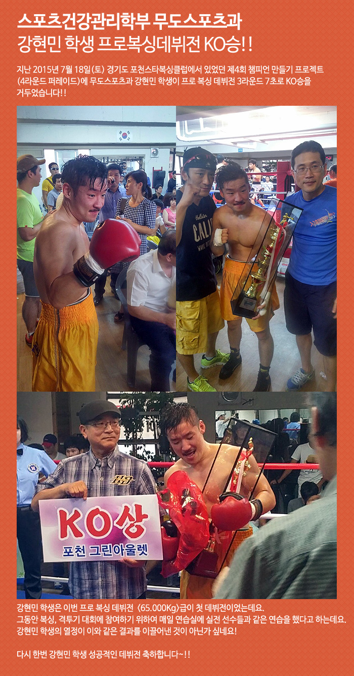 지난 2015년 7월 18일(토) 경기도 포천스타복싱클럽에서 있었던 제4회 챔피언 만들기 프로젝트(4라운드 퍼레이드)에 무도스포츠과 강현민 학생이 프로 복싱 데뷔전 3라운드 7초로 KO승을 거두었습니다!!