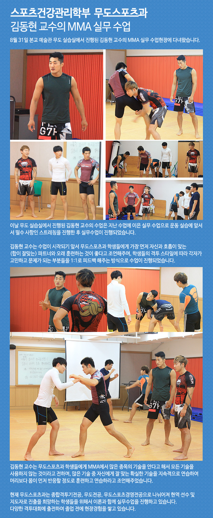 8월 31일 본교 예술관 무도 실습실에서 진행된 김동현 교수의 MMA 실무 수업현장에 다녀왔습니다.