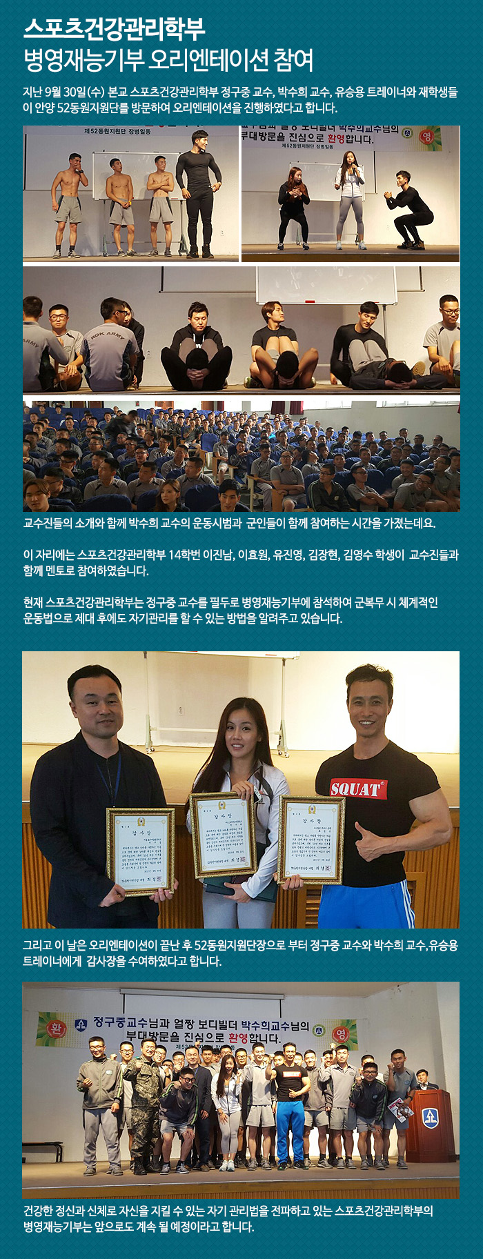 지난 9월 30일(수) 본교 스포츠건강관리학부 정구중 교수, 박수희 교수, 유승용 트레이너와 재학생들이 안양 52동원지원단를 방문하여 오리엔테이션을 진행하였다고 합니다.