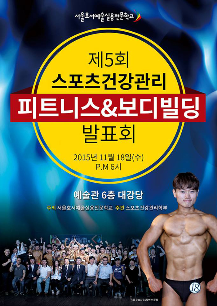 제5회 스포츠건강관리 피트니스&보디빌딩 발표회가 11월 18일 (수) 오후 6시에 예술관 6층 대강당에서 진행됩니다.