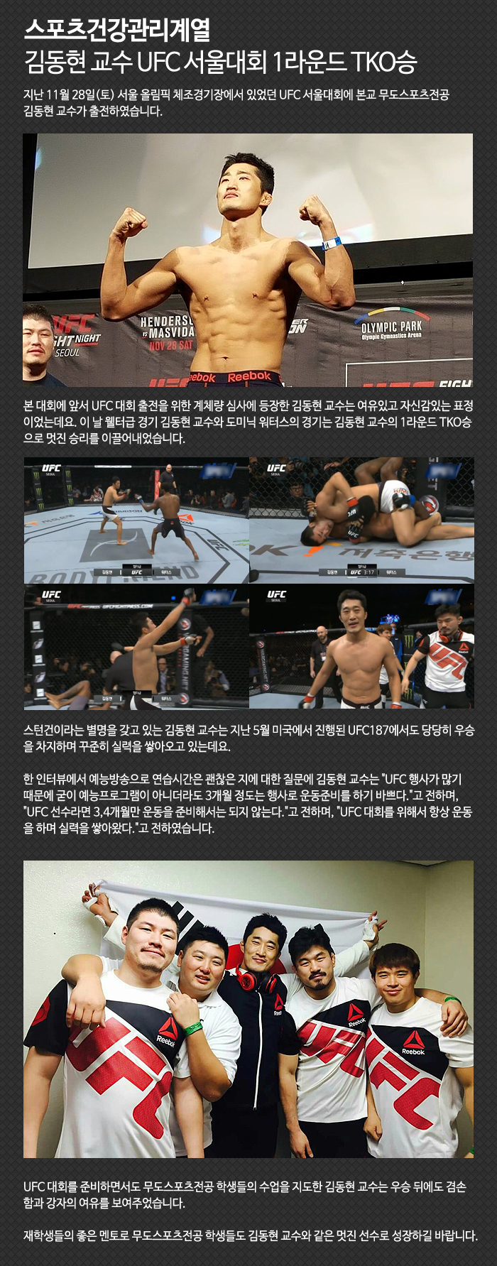 지난 11월 28일(토) 서울 올림픽 체조경기장에서 있었던 UFC 서울대회에 본교 무도스포츠전공 김동현 교수가 출전하였습니다.