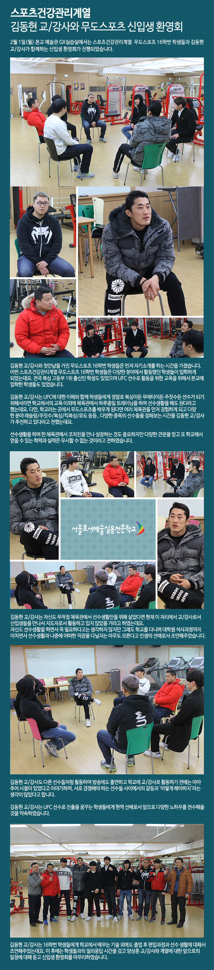 2월 1일(월) 본교 예술관 GX실습실에서는 스포츠건강관리계열 무도스포츠 16학번 학생들과 김동현 교/강사가 함께하는 신입생 환영회가 진행되었습니다.