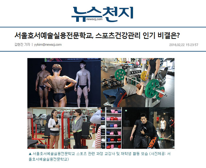 한편 서울호서예술실용전문학교는 2016학년도 입학생을 추가모집 중이며, 타학교 지원 및 수능 및 내신 성적 등에 관계없이 추가 지원이 가능하다. 현재 홈페이지에서 지원가능하며 스포츠건강관리계열은 100% 면접으로 선별하고 있다.