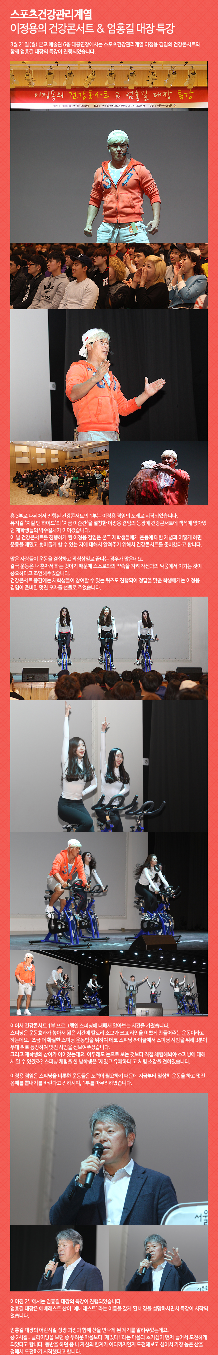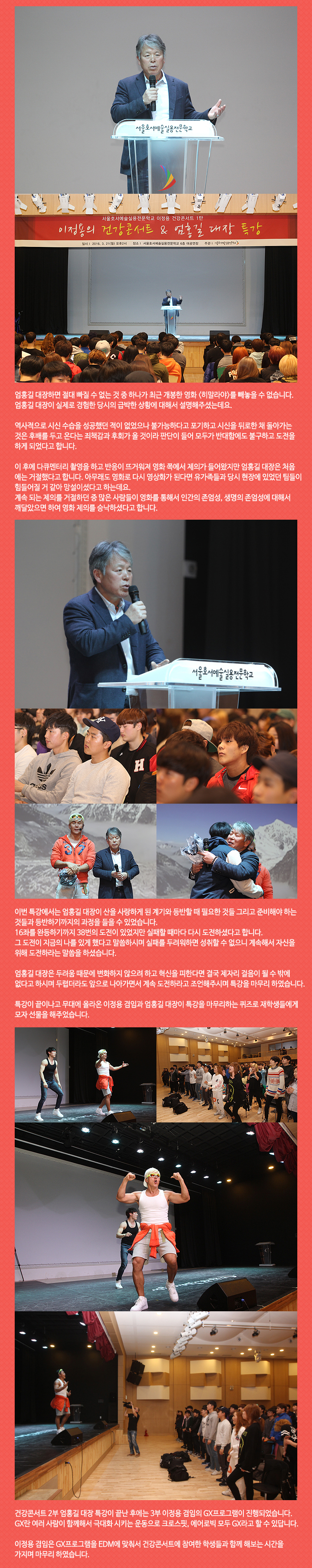 3월 21일(월) 본교 예술관 6층 대공연장에서는 스포츠건강관리계열 이정용 겸임의 건강콘서트와 함께 엄홍길 대장의 특강이 진행되었습니다.