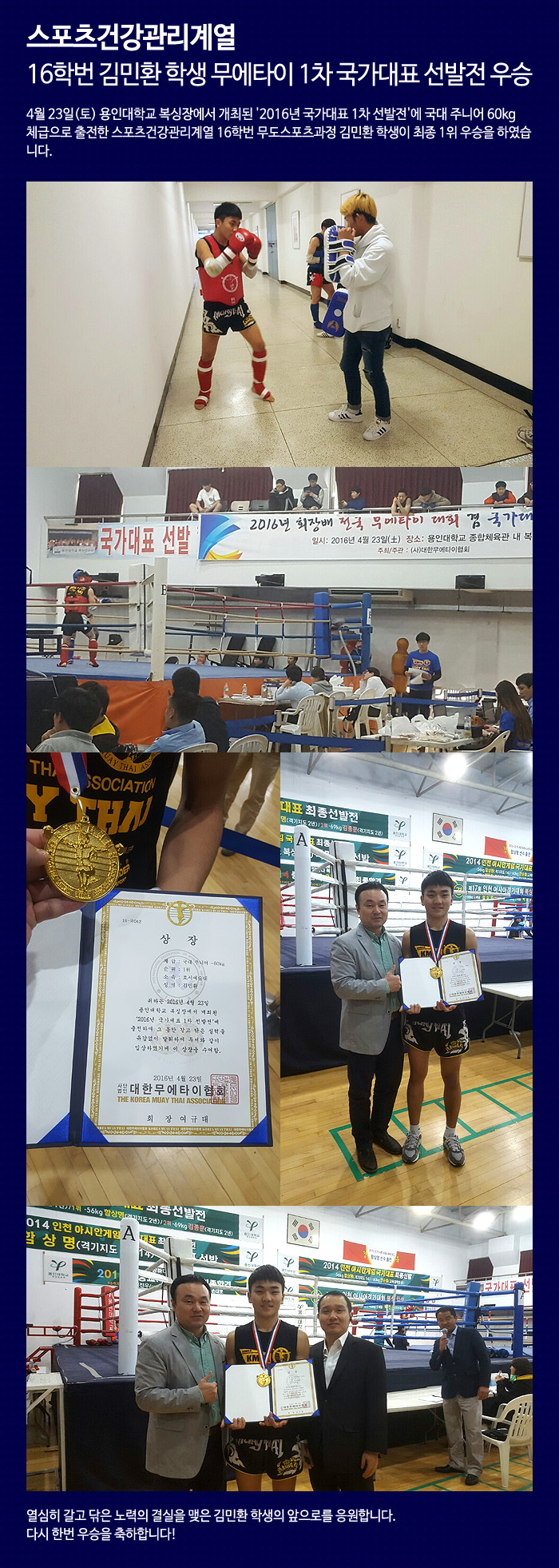 4월 23일(토) 용인대학교 복싱장에서 개최된 '2016년 국가대표 1차 선발전'에 국대 주니어 60kg 체급으로 출전한 스포츠건강관리계열 16학번 무도스포츠과정 김민환 학생이 최종 1위 우승을 하였습니다.