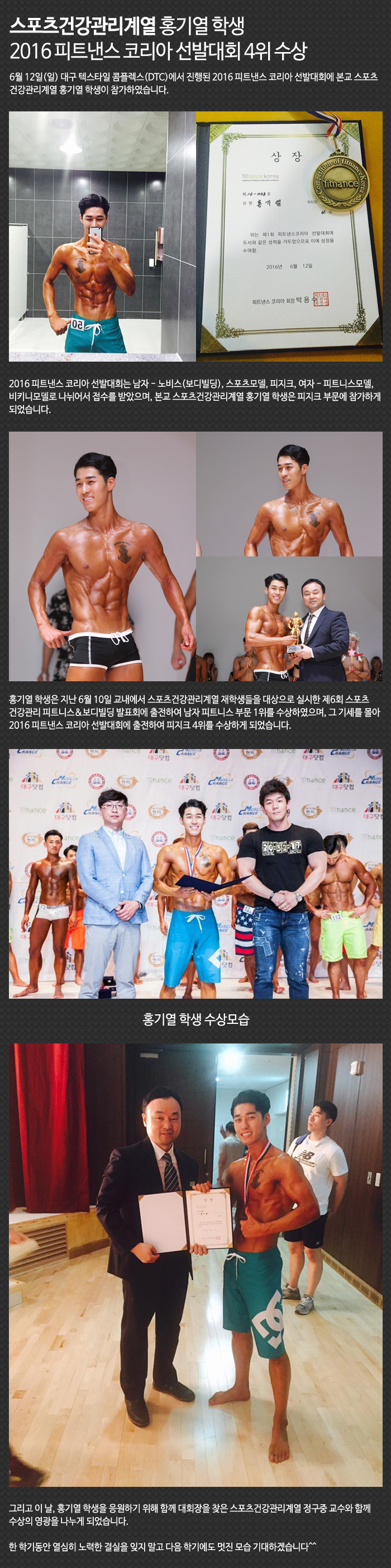6월 12일(일) 대구 텍스타일 콤플렉스(DTC)에서 진행된 2016 피트낸스 코리아 선발대회에 본교 스포츠건강관리계열 홍기열 학생이 참가하였습니다.