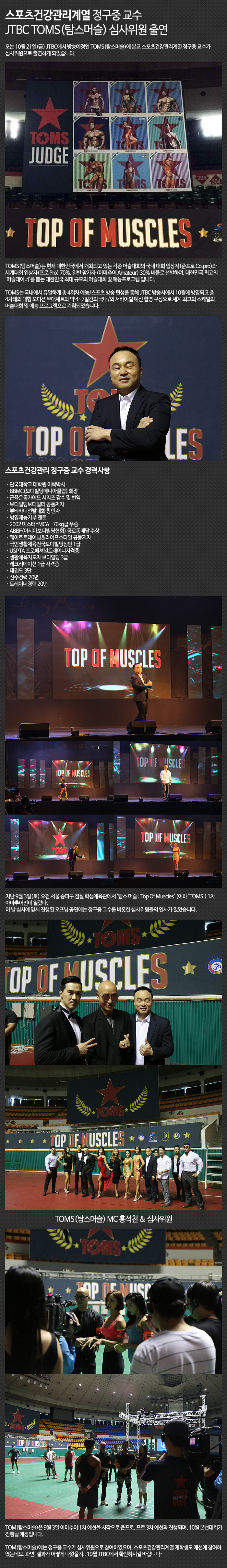 오는 10월 21일(금) JTBC에서 방송예정인 TOMS(탐스머슬)에 본교 스포츠건강관리계열 정구중 교수가 심사위원으로 출연하게 되었습니다.