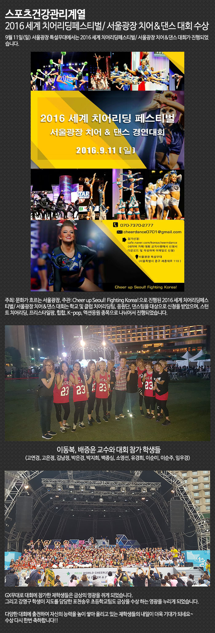 9월 11일(일) 서울광장 특설무대에서는 2016 세계 치어리딩페스티벌/ 서울광장 치어&댄스 대회가 진행되었습니다.