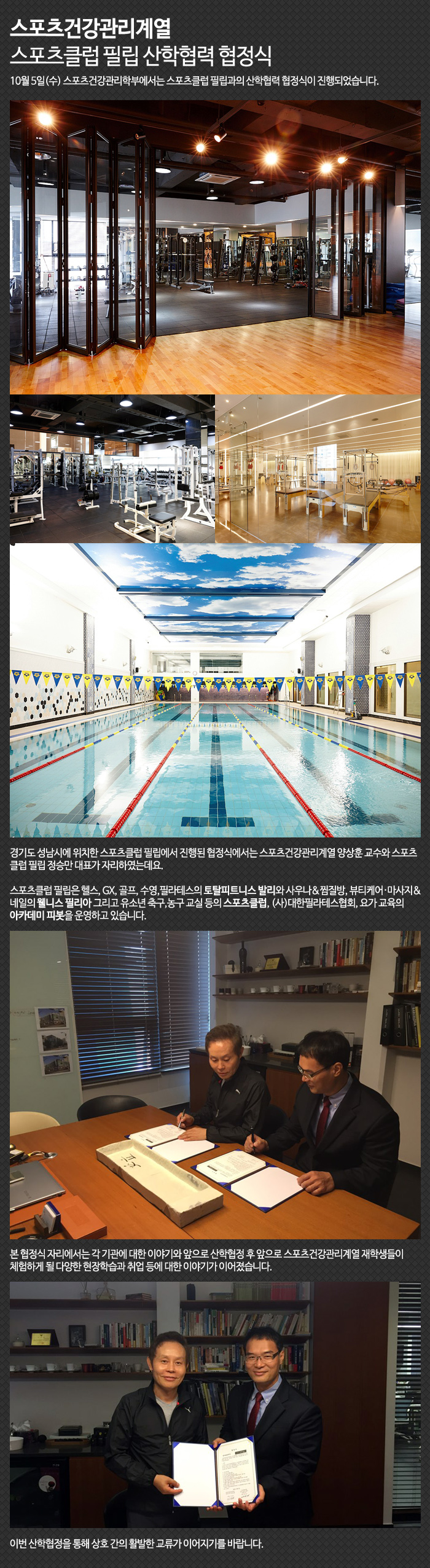 10월 5일(수) 스포츠건강관리학부에서는 스포츠클럽 필립과의 산학협력 협정식이 진행되었습니다.