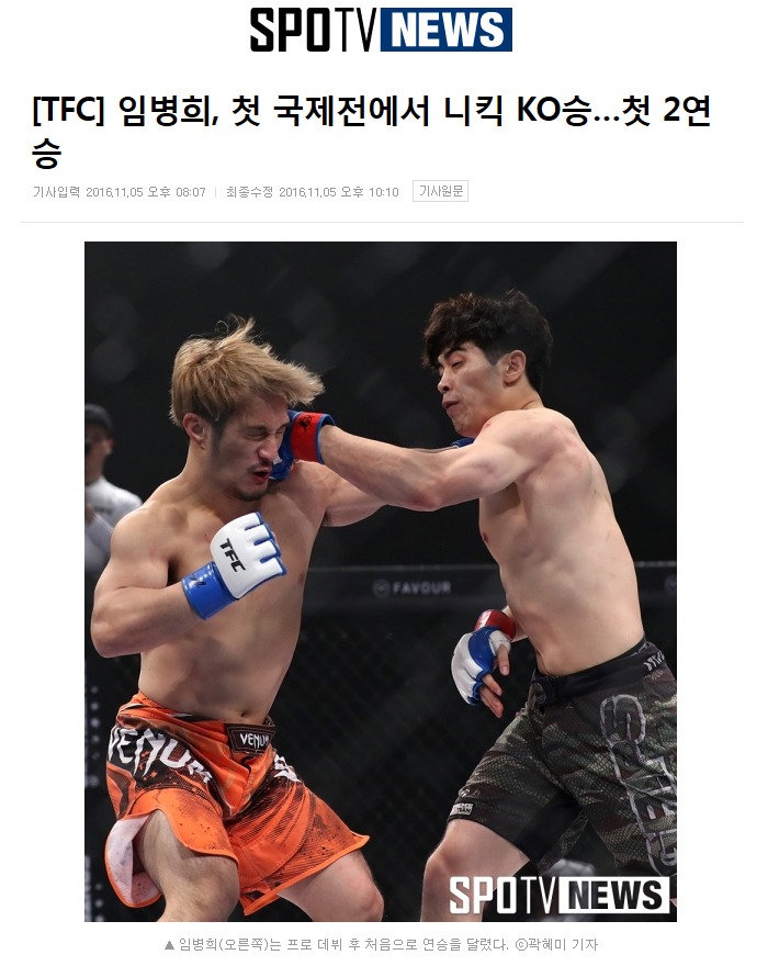 [스포티비뉴스]TFC 임병희, 첫 국제전에서 니킥 KO승…첫 2연승