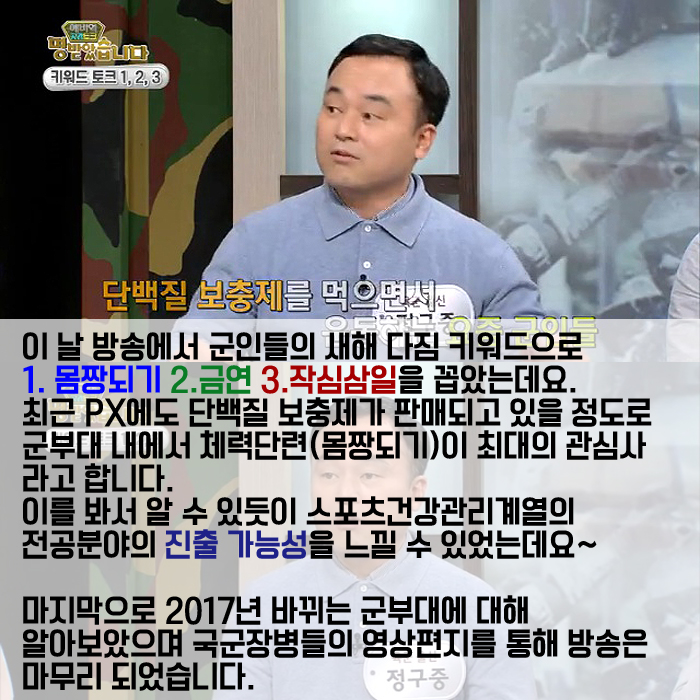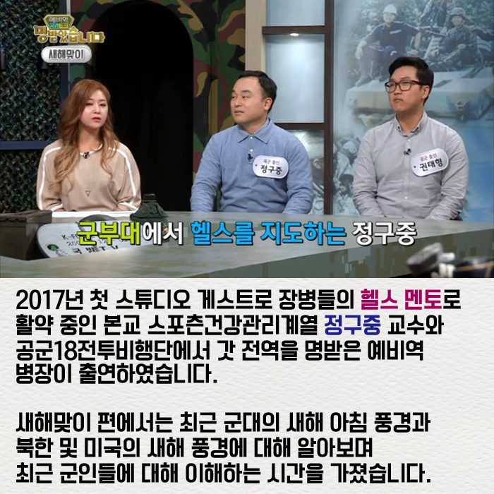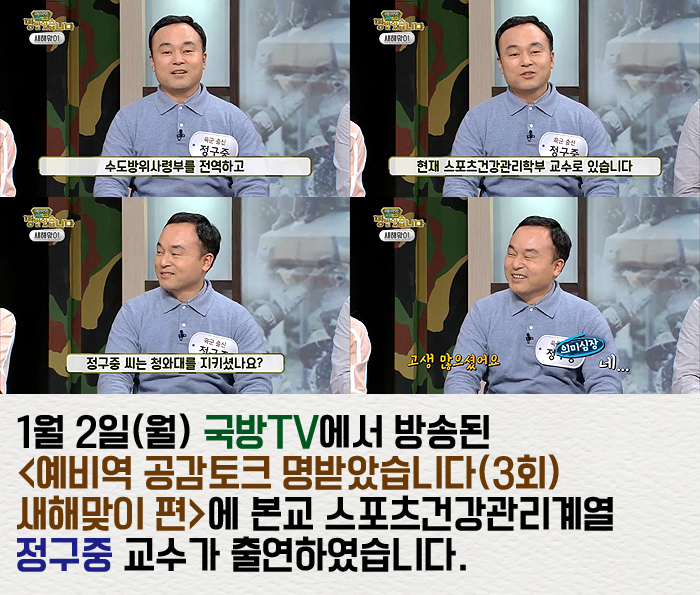 1월 2일(월) 국방TV에서 방영된 예비역 공감토크, 명받았습니다(3회) 새해맞이 편에 본교 스포츠건강관리계열 정구중 교수가 게스트로 출연하였습니다.