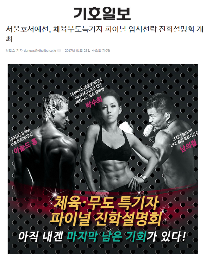 서울 강서구 가양동에 위치한 서울호서예술실용전문학교(이하 서울호서예전)가 2월8일(수) 오후 2시에 체육 무도 특기자 파이널 입시전략 진학설명회를 개최한다.