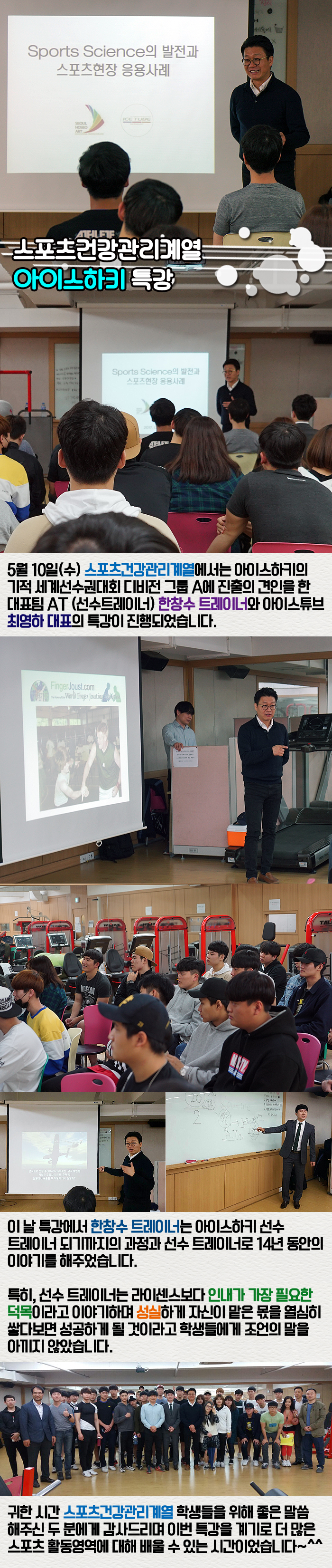5월 10일(수) 스포츠건강관리계열에서는 아이스하키의 기적 세계선수권대회 디비전 그룹 A에 진출의 견인을 한 대표팀 AT (선수트레이너) 한창수 트레이너와 아이스튜브 최영하 대표의 특강이 진행되었습니다.