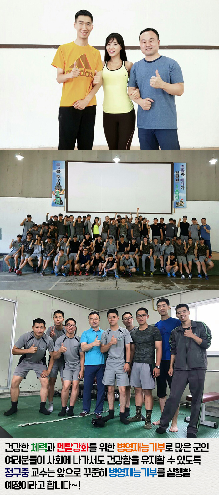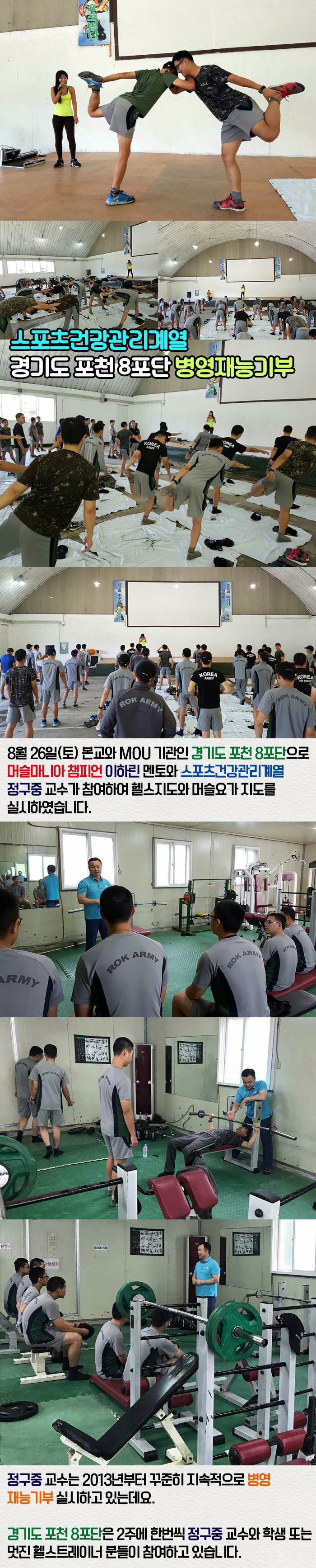 8월 26일(토) 본교와 MOU 기관인 경기도 포천 8포단으로 머슬마니아 챔피언 이하린 멘토와 스포츠건강관리계열 정구중 교수가 참여하여 헬스지도와 머슬요가 지도를 실시하였습니다.