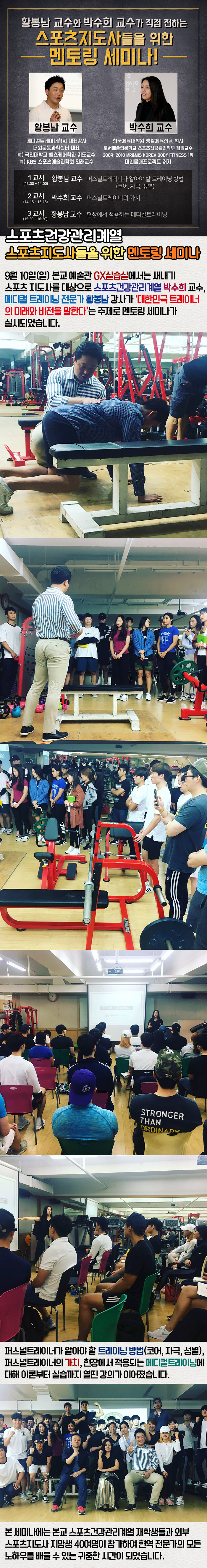 9월 10일(일) 본교 예술관 GX실습실에서는 새내기 스포츠지도사를 대상으로 본교 스포츠건강관리계열 박수희 교수가 메디컬 트레이닝 전문가 황봉남 강사가 '대한민국 트레이너의 미래와 비전을 말한다'는 주제로 멘토링 세미나가 실시되었습니다.