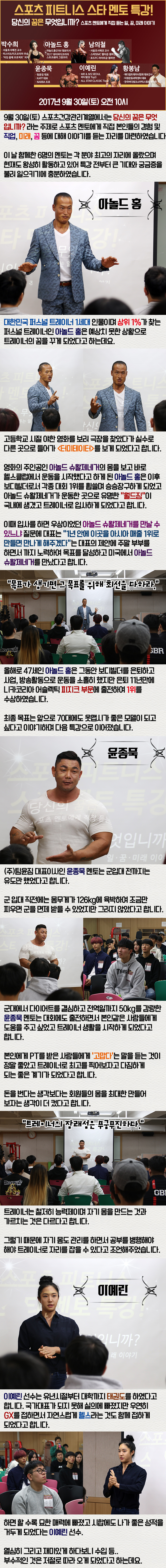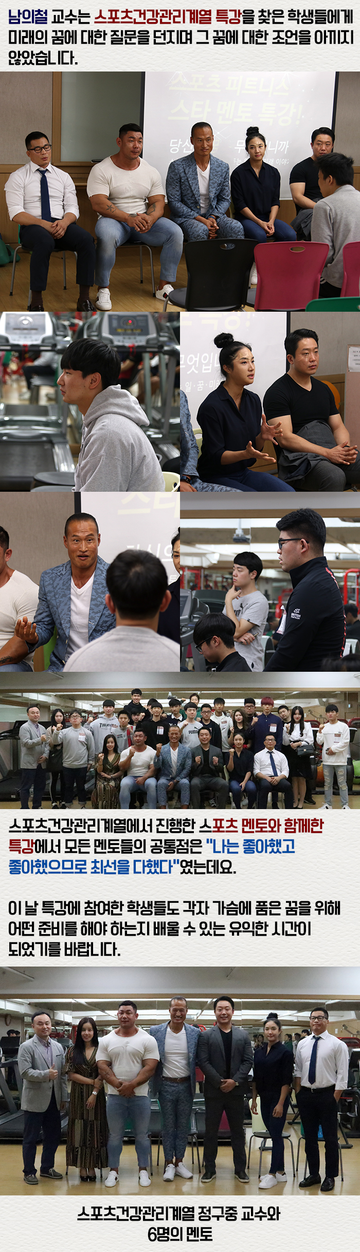 9월 30일(토) 스포츠건강관리계열에서는 당신의 꿈은 무엇입니까? 라는 주제로 스포츠 멘토에게 직접 본인들의 경험 및 직업, 미래, 꿈 등에 대해 이야기를 듣는 자리를 마련하였습니다.