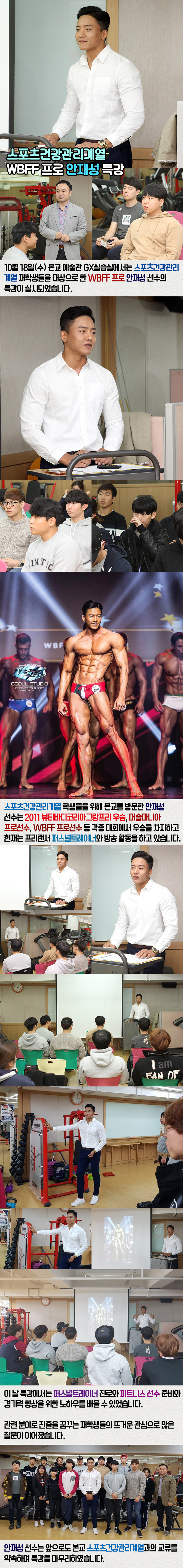 10월 18일(수) 본교 예술관 GX실습실에서는 스포츠건강관리계열 재학생들을 대상으로 한 WBFF 프로 안재성 선수의 특강이 실시되었습니다.