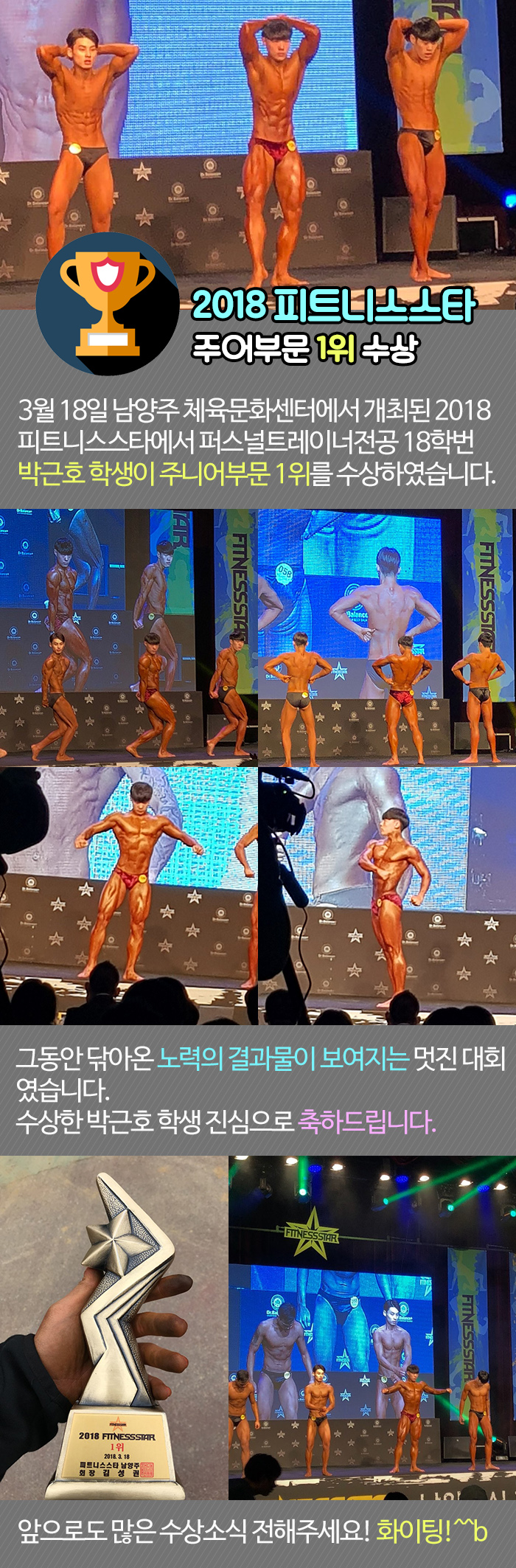 3월 18일 남양주 체육문화센터에서 개최된 2018 피트니스스타에서 퍼스널트레이너전공 18학번 박근호 학생이 주니어부문 1위를 수상하였습니다.