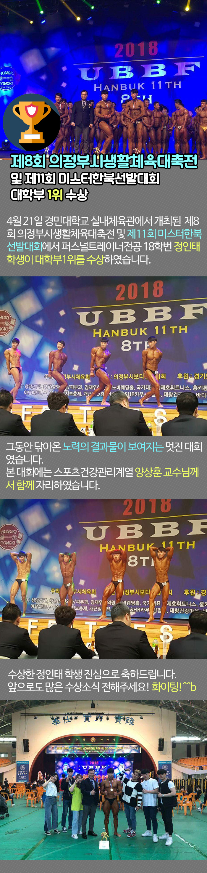 4월 21일 경민대학교 실내체육관에서 개최된 제8회 의정부시생활체육대축전 및 제11회 미스터한북선발대회에서 퍼스널트레이너전공 18학번 정인태 학생이 대학부1위를 수상하였습니다.
