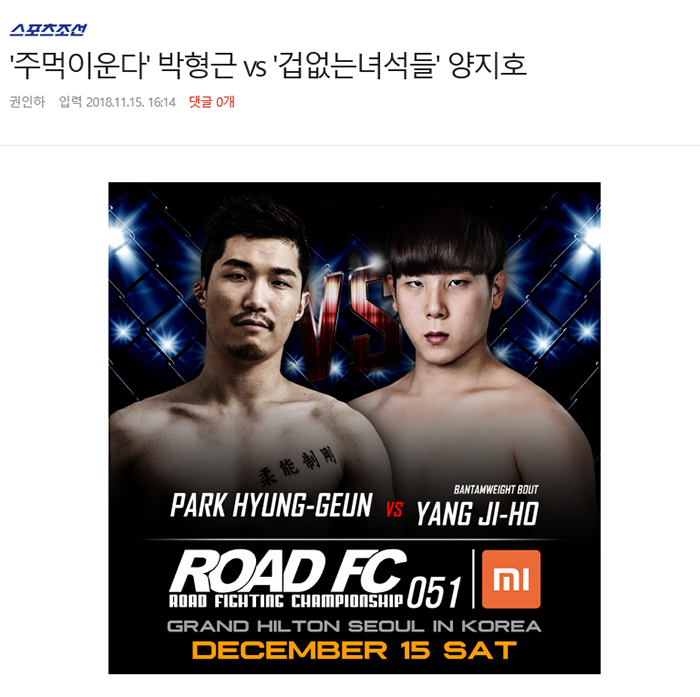 박형근과 양지호는 그랜드 힐튼 서울에서 12월 15일 열리는 XIAOMI ROAD FC 051에 출전한다.