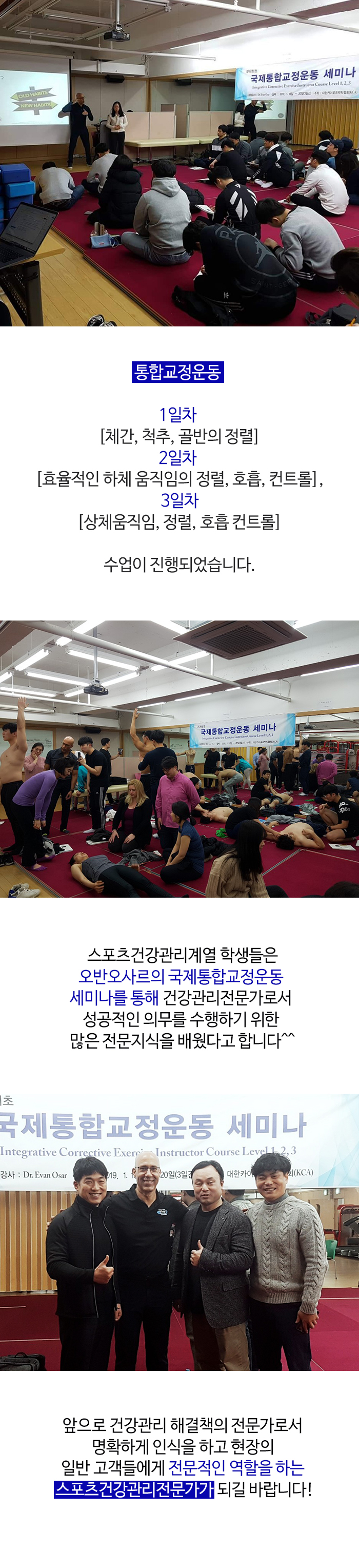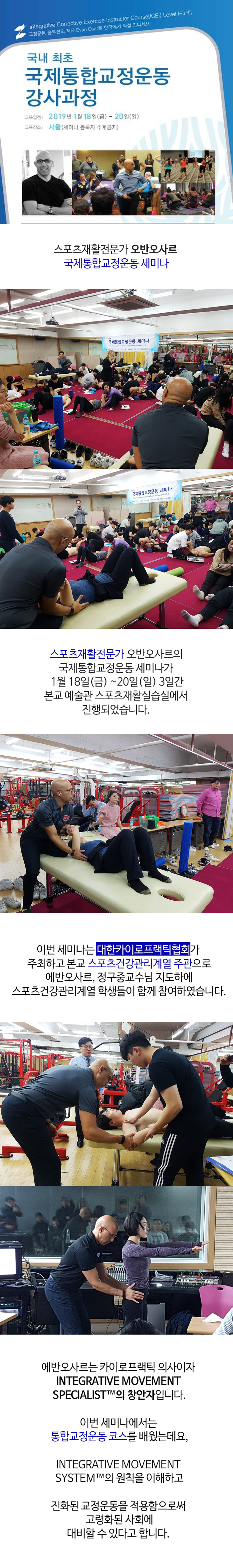 스포츠재활전문가 오반오사르의 국제통합교정운동 세미나가 1월 18일(금) ~20일(일) 3일간 본교 예술관 스포츠재활실습실에서 진행되었습니다.