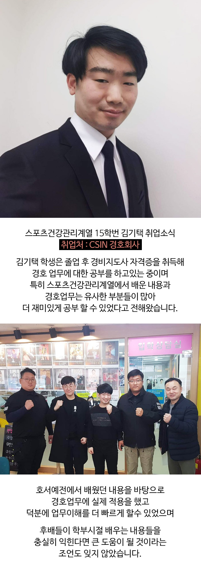 스포츠건강관리계열 15학번 김기택 학생이 취업 소식을 전해왔습니다.