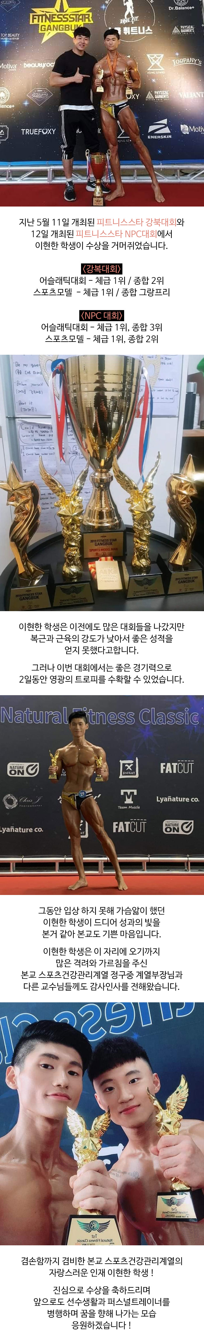 지난 5월 11일 개최된 피트니스스타 강북대회와 12일 개최된 피트니스스타 NPC대회에서 이현한 학생이 수상을 거머쥐었습니다.