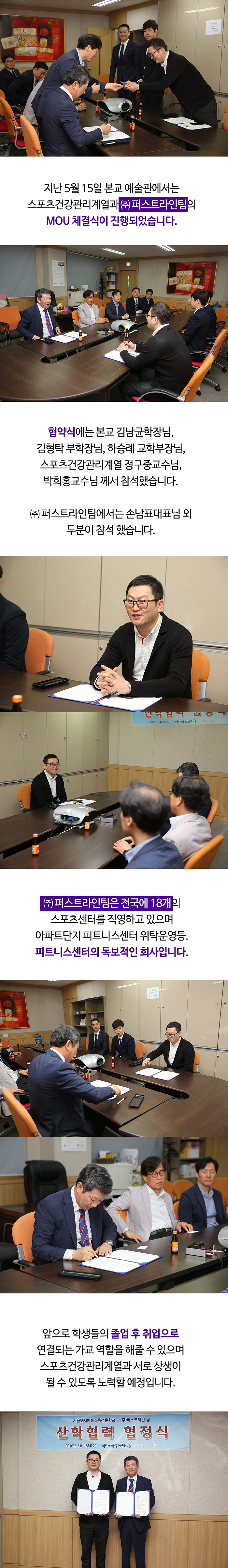 지난 5월 15일 본교 예술관에서는 스포츠건강관리계열과 ㈜퍼스트라인팀의 MOU 체결식이 진행되었습니다.