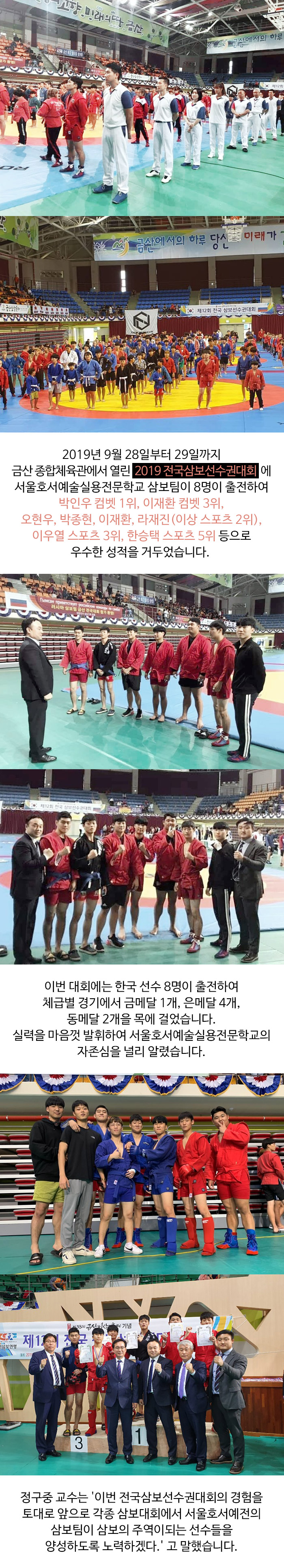9월 28일부터 29일까지 금산 종합체육관에서 열린 '2019 전국삼보선수권대회'에 서울호서예술실용전문학교 삼보팀이 8명이 출전하여 박인우 컴벳 1위, 이재환 컴벳 3위, 오현우, 박종현, 이재환, 라재진(이상 스포츠 2위), 이우열 스포츠 3위, 한승택 스포츠 5위 등으로 우수한 성적을 거두었습니다.