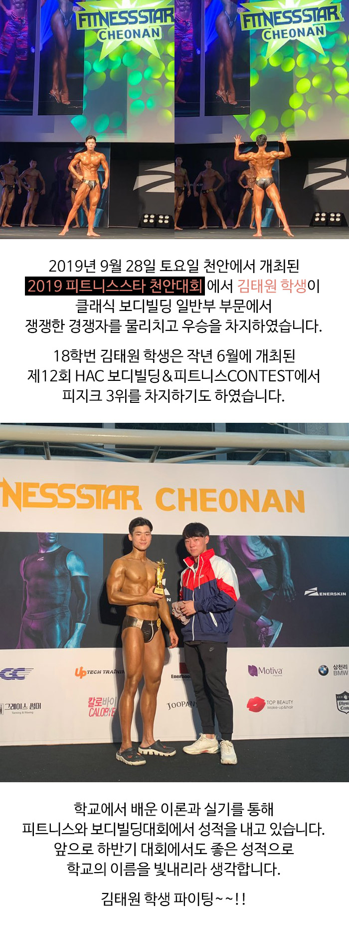 2019년 9월 28일 토요일 천안에서 개최된 2019 피트니스스타 천안대회에서 김태원 학생이 클래식 보디빌딩 일반부 부문에서 쟁쟁한 경쟁자를 물리치고 우승을 차지하였습니다.