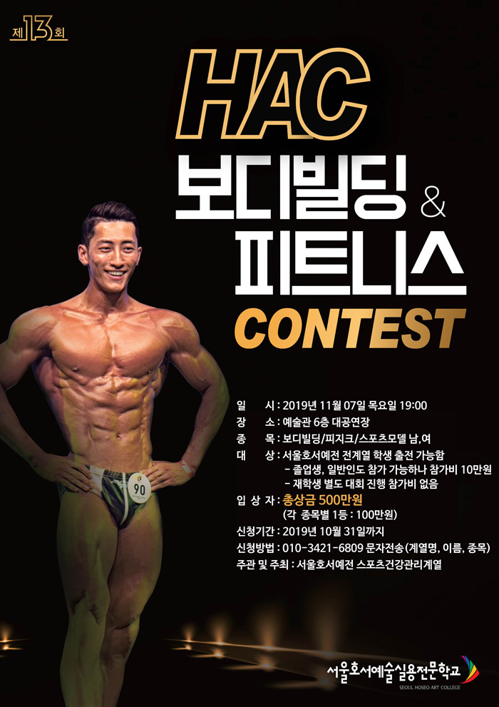 본교 스포츠건강관리계열 주최로 오는 11월 07일(목) 오후 7시 '제 13회 서울호서예전 보디빌딩&피트니스 콘테스트'를 진행합니다.