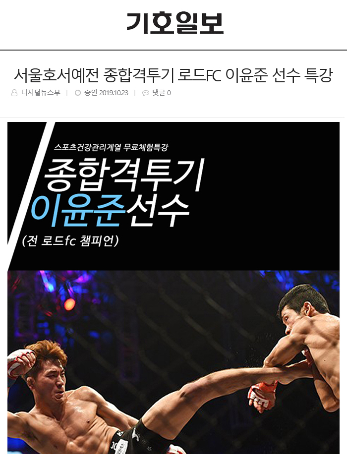 서울호서예술실용전문학교(이하 서울호서예전) 스포츠건강관리계열 내 종합격투기 과정에서 다가오는 11월 2일 해당 학교 졸업생이자 로드FC 챔피언을 지낸 이윤준선수의 종합격투기 특강을 무료로 고등학교 학생들을 대상으로 진행한다고 학교 관계자가 전했다.