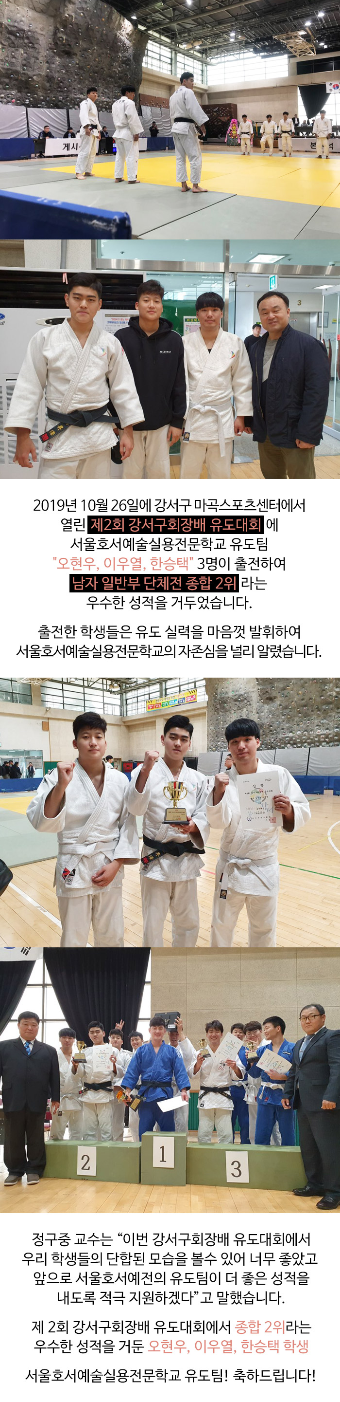 2019년 10월 26일에 강서구 마곡스포츠센터에서 열린 제2회 강서구회장배 유도대회에 서울호서예술실용전문학교 유도팀