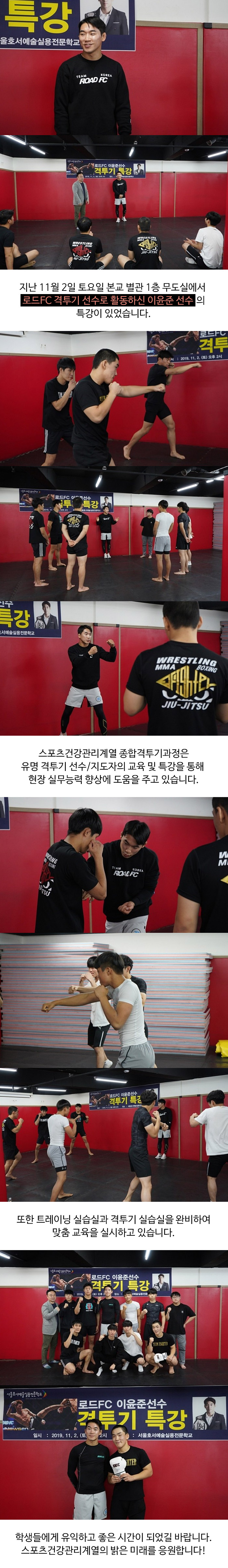 지난 11월 2일 토요일 본교 별관 1층 무도실에서 로드FC 격투기 선수로 활동하신 이윤준 선수의 특강이 있었습니다.