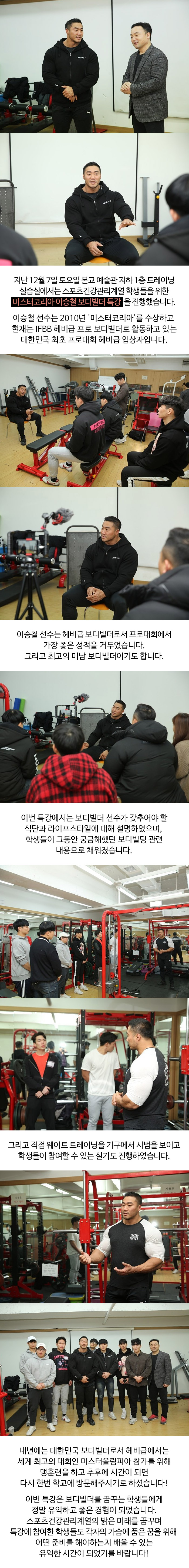 지난 12월 7일 토요일 본교 예술관 지하 1층 트레이닝 실습실에서는 스포츠건강관리계열 학생들을 위한 미스터코리아 이승철 보디빌더 특강을 진행했습니다.