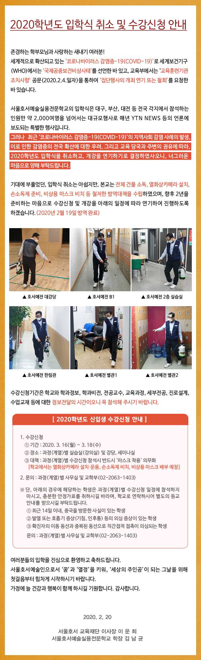 2020학년도 입학식 취소 및 수강신청 안내
