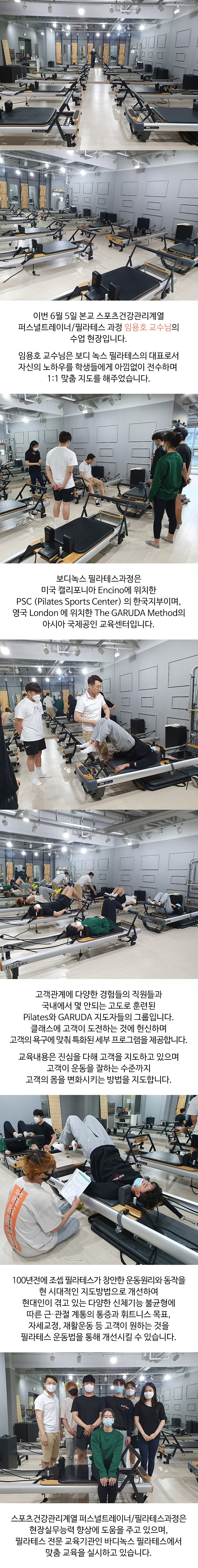 지난 6월 5일 본교 스포츠건강관리계열 퍼스널트레이너/필라테스 과정 임용호 교수님의 수업 현장을 공개합니다.