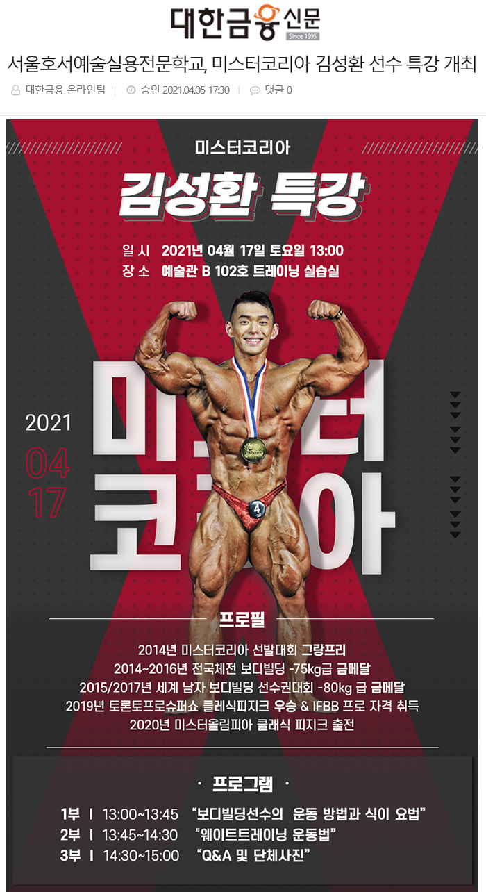 [언론보도]미스터코리아 김성환 선수 특강 개최