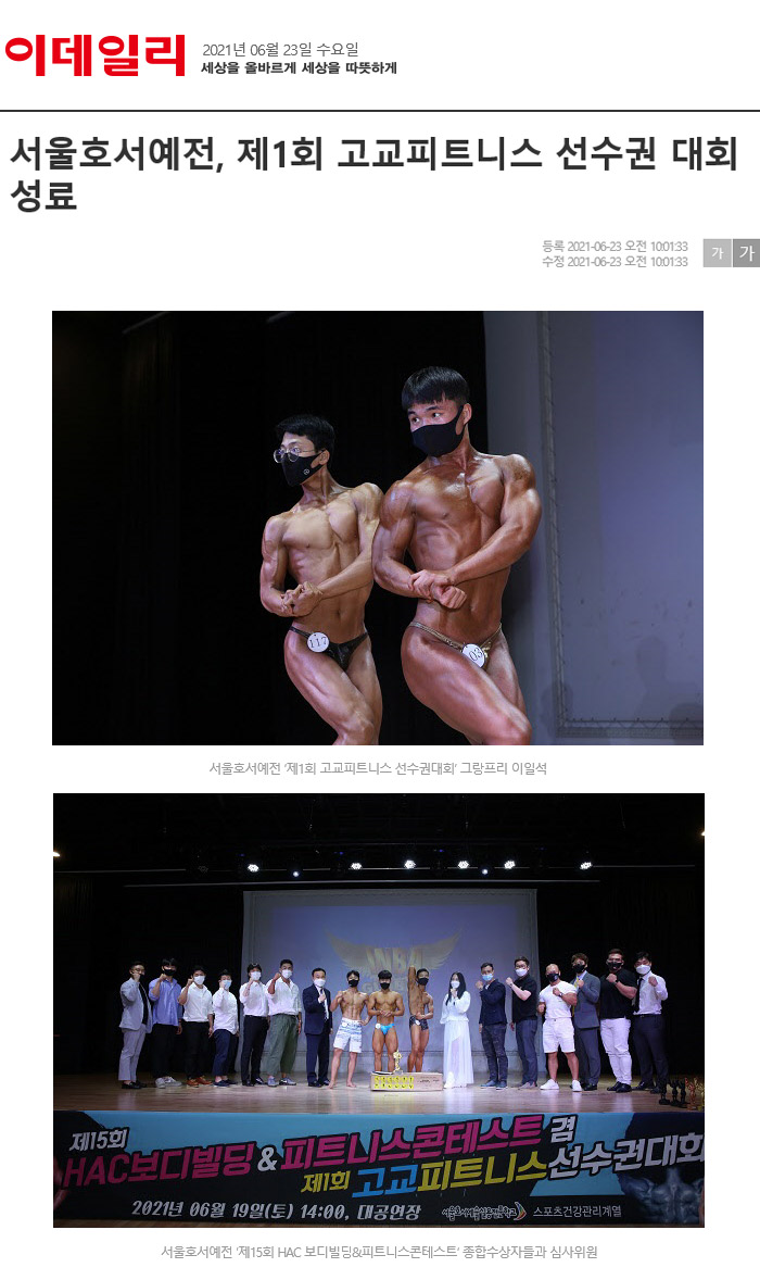 서울호서예전 스포츠건강관리계열에서 주최·주관하고, 맥스큐, 스포맥스, 머슬마니아 등이 후원한 이번 대회는 전국의 고등학생 100여명이 참가하여 열띤 경연을 펼쳤다.