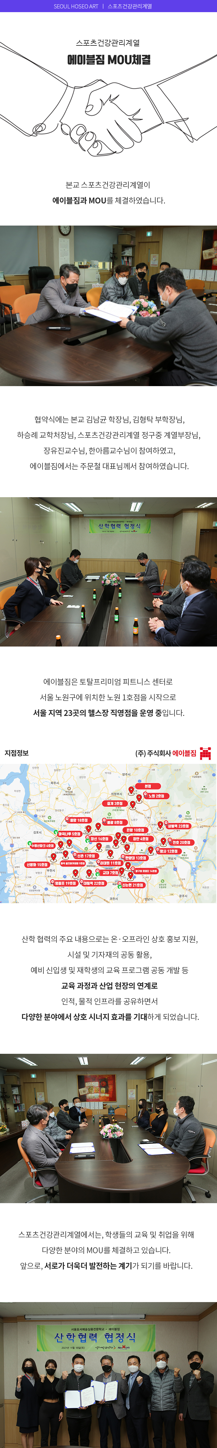 스포츠건강관리계열에서는 에이블짐과 MOU를 체결하였습니다. 서울호서예술실용전문학교와 Mou를 체결한 에이블짐은 토탈프리미엄 피트니스 센터로 서울 노원구에 위치한 노원 1호점을 시작으로 서울 지역 23곳의 헬스장 직영점을 운영 중입니다.