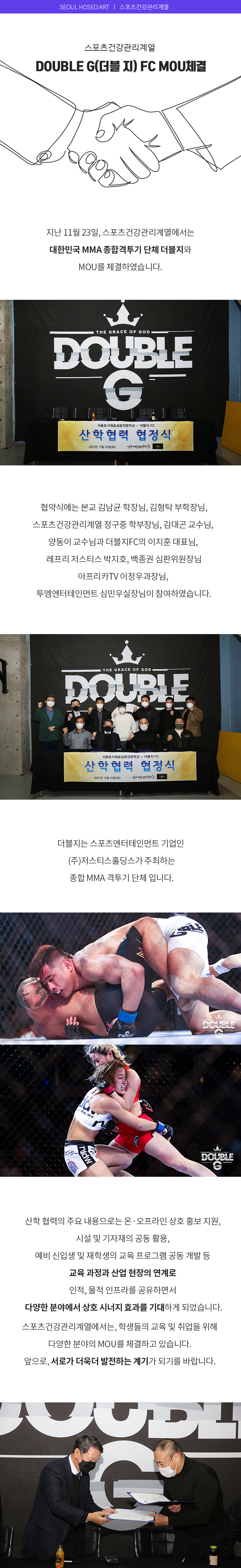스포츠건강관리계열에서는 대한민국 MMA 종합격투기 단체 더블지(DOUBLE G)와 MOU를 체결하였습니다. 서울호서예술실용전문학교와 MOU를 체결한 더블지는 스포츠엔터테인먼트 기업인 (주)저스티스홀딩스가 주최하는 종합 MMA 격투기 단체입니다.