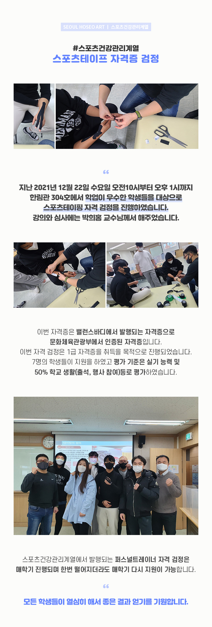 서울호서예술실용전문학교 스포츠건강관리계열 스포츠테이프 자격증 검정 지난 2021년 12월 22일 수요일 오전10시부터 오후 1시까지 한림관 304호에서 학업이 우수한 학생들을 대상으로 스포츠테이핑 자격 검정을 진행하였습니다. 이번 자격증은 밸런스바디에서 발행되는 자격증으로 문화체육관광부에서 인증된 자격증입니다.