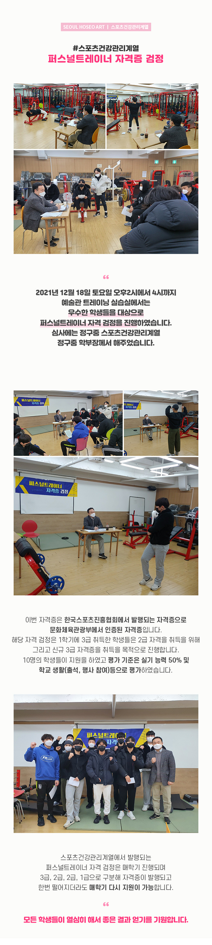 서울호서예술실용전문학교 스포츠건강관리계열 퍼스널트레이너 자격증 검정 2021년 12월 18일 토요일 오후2시에서 4시까지 예술관 트레이닝 실습실에서는 우수한 학생들을 대상으로 퍼스널트레이너 자격 검정을 진행하였습니다.