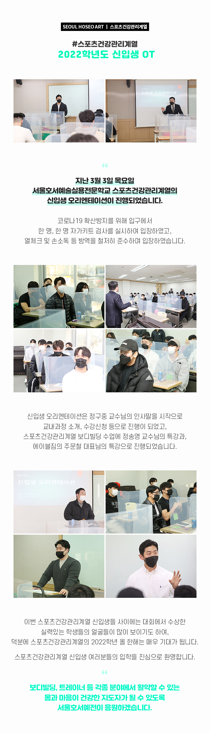 지난 3월 3일 목요일 서울호서예술실용전문학교 스포츠건강관리계열의 신입생 오리엔테이션이 진행되었습니다. 코로나19 확산방지를 위해 입구에서 한 명, 한 명 자가키트 검사를 실시하여 입장하였고, 열체크 및 손소독 등 방역을 철저히 준수하며 입장하였습니다. 신입생 오리엔테이션은 정구중 교수님의 인사말을 시작으로 교내과정 소개, 수강신청 등으로 진행이 되었고, 스포츠건강관리계열 보디빌딩 수업에 정송용 교수님의 특강과, 에이블짐의 주문철 대표님의 특강으로 진행되었습니다.