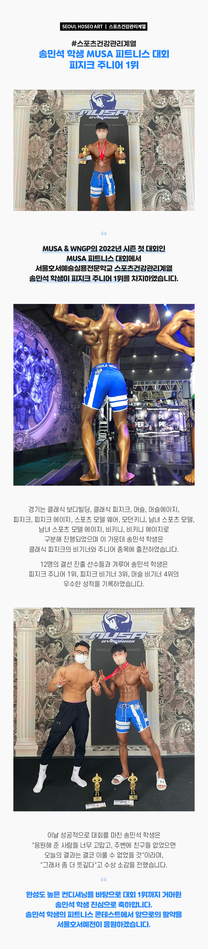 MUSA & WNGP의 2022년 시즌 첫 대회인 MUSA 피트니스 대회에서 서울호서예술실용전문학교 스포츠건강관리계열 송민석 학생이 피지크 주니어 1위를 차지하였습니다. MUSA 경기 대회에는 약 360여명의 내추럴 선수들이 출전하여 치열한 경쟁을 펼쳤습니다. 경기는 클래식 보디빌딩, 클래식 피지크, 머슬, 머슬에이지, 피지크, 피지크 에이지, 스포츠 모델 웨어, 모던키니, 남녀 스포츠 모델, 남녀 스포츠 모델 에이지, 비키니, 비키니 에이지로 구분해 진행되었으며 이 가운데 송민석 학생은 클래식 피지크의 비기너와 주니어 종목에 출전하였습니다. 12명의 결선 진출 선수들과 겨루어 송민석 학생은 피지크 주니어 1위, 피지크 비기너 3위, 머슬 비기너 4위의 우수한 성적을 기록하였습니다.