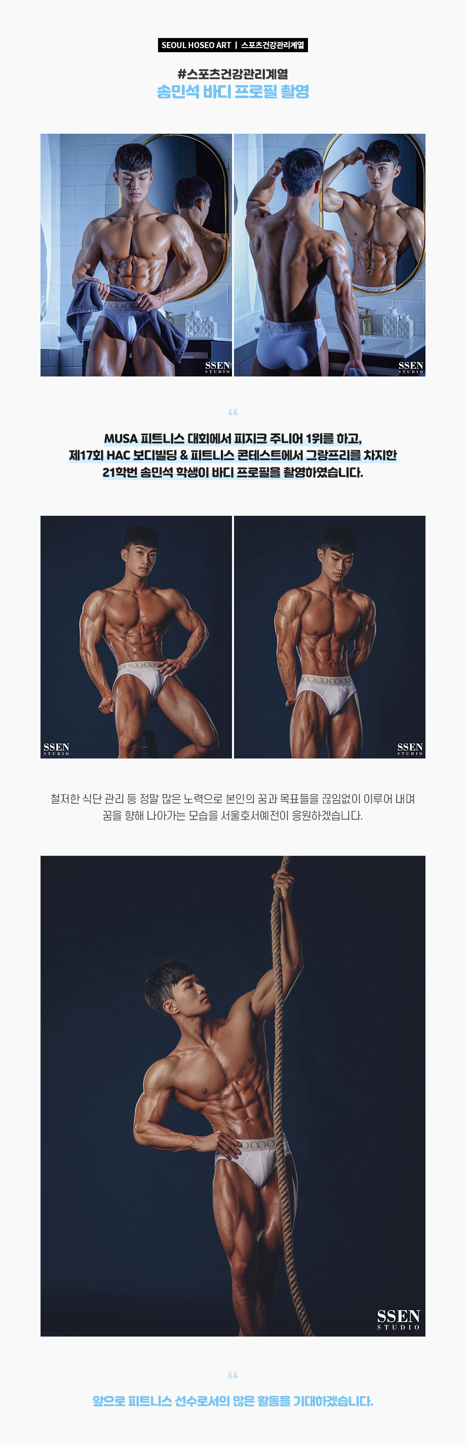 MUSA 피트니스 대회에서 피지크 주니어 1위를 하고, 제17회 HAC 보디빌딩 & 피트니스 콘테스트에서 그랑프리를 차지한 21학번 송민석 학생이 바디 프로필을 촬영하였습니다. 철저한 식단 관리 등 정말 많은 노력으로 본인의 꿈과 목표들을 끊임없이 이루어 내며 꿈을 향해 나아가는 모습을 서울호서예전이 응원하겠습니다.
