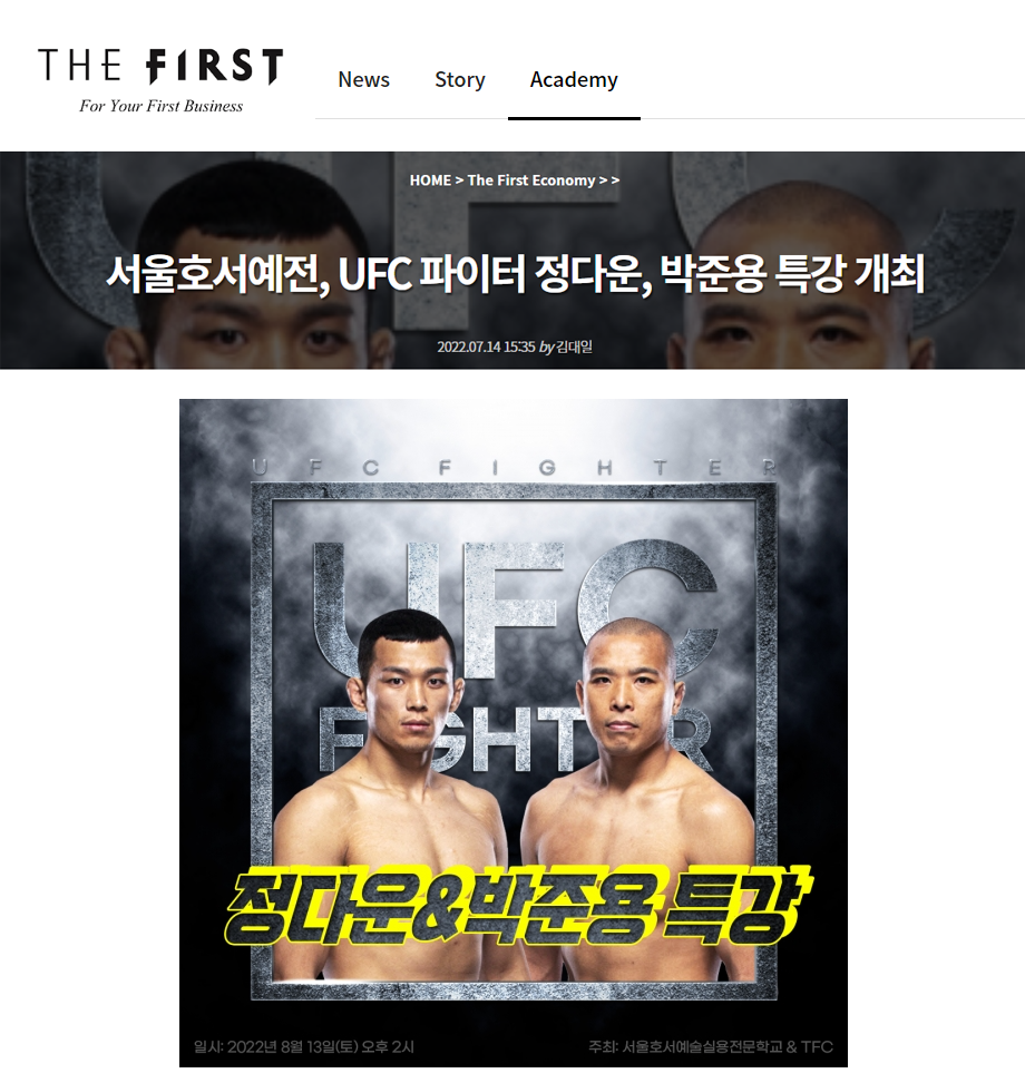 서울호서예술실용전문학교(이하 서울호서예전)와 TFC가 오는 8월 13일 토요일에 UFC 파이터 정다운&박준용 특강을 개최한다고 밝혔다.이번 UFC 파이터 특강은 UFC와 종합격투기에 관심 있는 고등학생들을 대상으로 진행되며 UFC 파이터인 정다운, 박준용이 참여하여 학생들에게 많은 노하우를 전수할 예정이다.