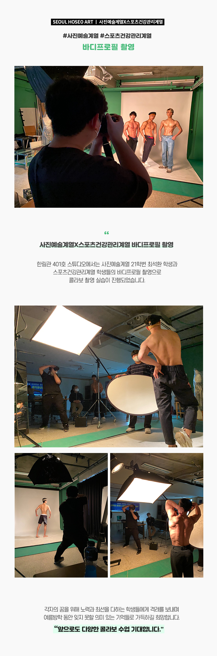 한림관 401호 스튜디오에서는 사진예술계열 21학번 최석환 학생과 스포츠건강관리계열 학생들의 바디프로필 촬영으로 콜라보 촬영 실습이 진행되었습니다.