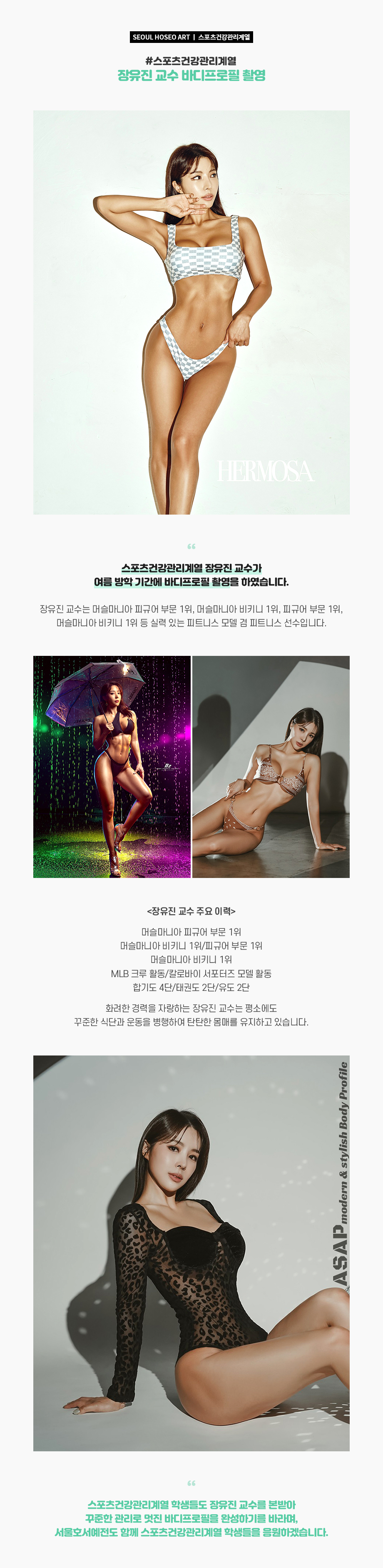 스포츠건강관리계열 장유진 교수가 여름 방학 기간에 바디프로필 촬영을 하였습니다. 장유진 교수는 머슬마니아 피규어 부문 1위, 머슬마니아 비키니 1위, 피규어 부문 1위, 머슬마니아 비키니 1위 등 실력 있는 피트니스 모델 겸 피트니스 선수입니다.